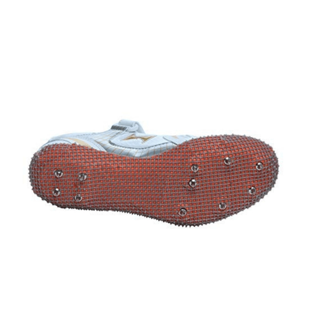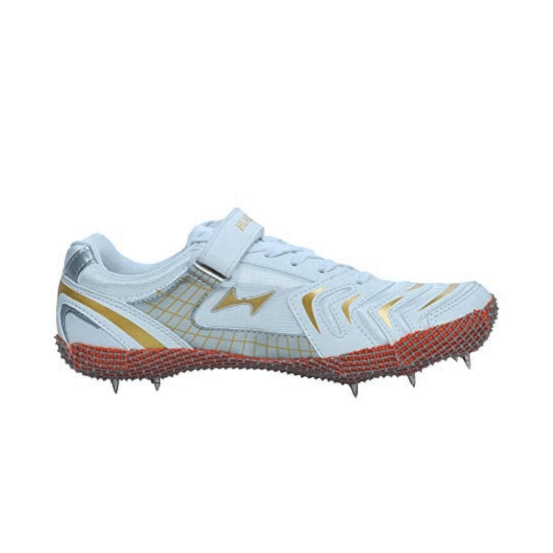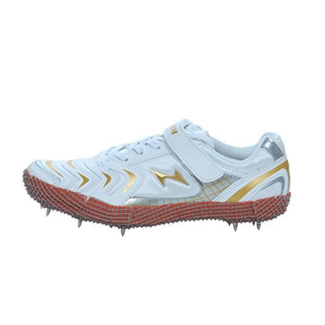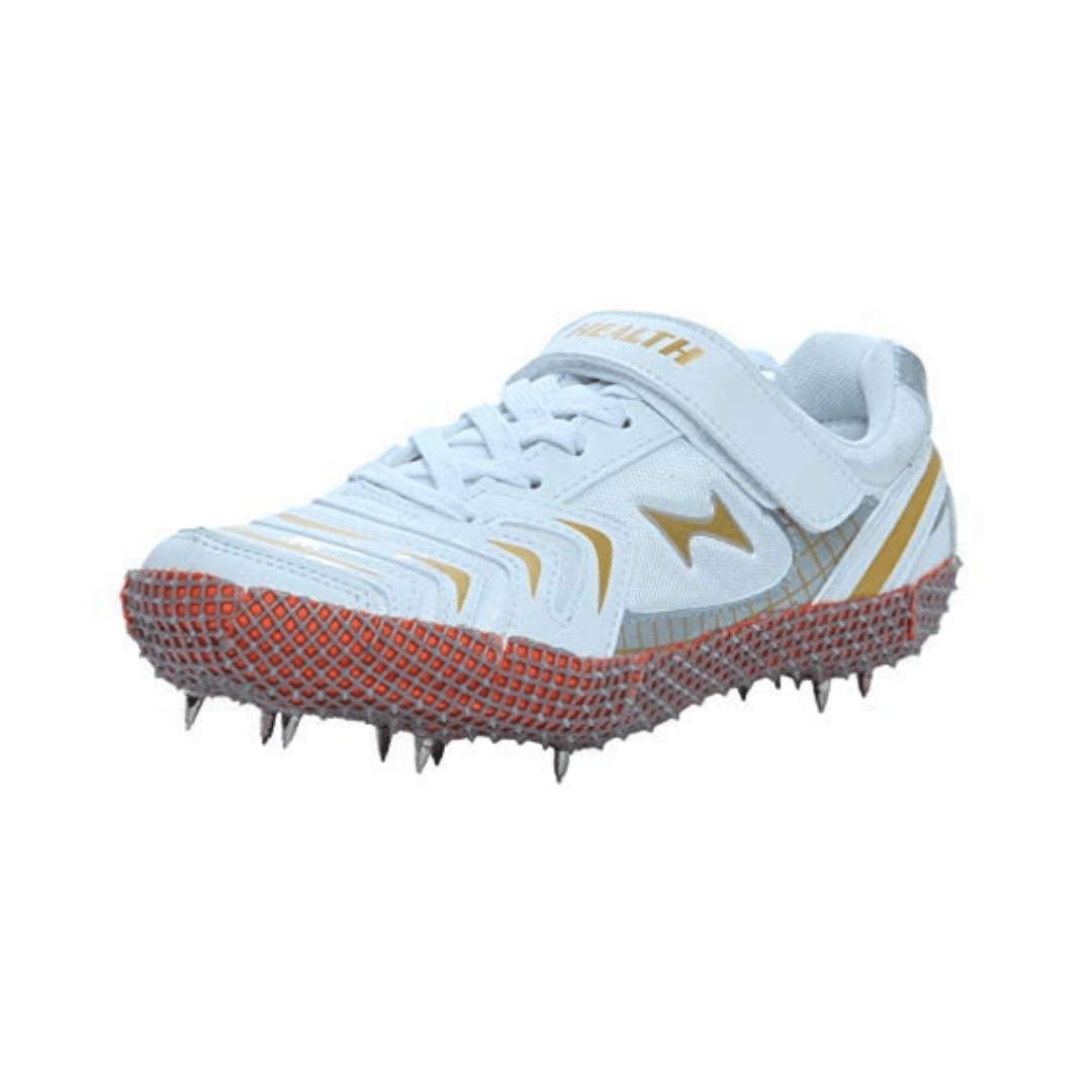 Health High Jump spikes (White/Gold) are designed for athletic performance, featuring a lightweight Mesh and PU (polyurethane) upper, a thermoplastic polyurethane (TPU) sole, and a 6mm drop. They offer a mid-ankle design for stability, featuring a lockdown strap and lace-up closure for a secure fit, with a weight of approximately 750g